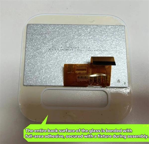 The entire back of the glass screen is covered with adhesive tape, and jigs are used for precise positioning during assembly.