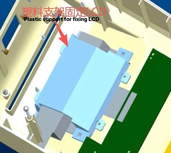 This method applies when a product has ample internal space and the display angle forms a certain degree with the mold ejection direction of the outer casing. A dedicated plastic bracket is made to support and fix the LCD screen, such as in blood pressure monitors.