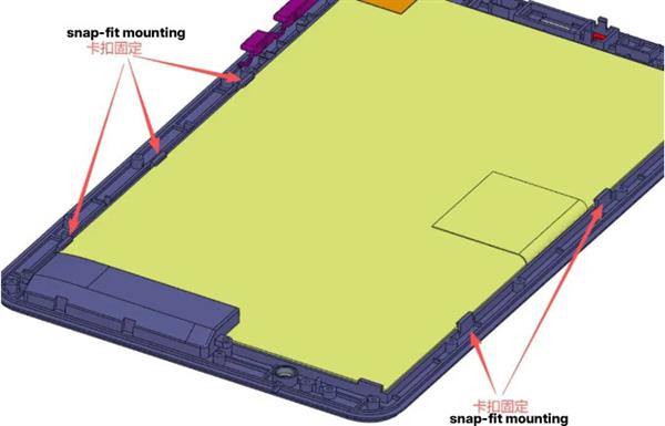 Widely used in electronic products, like early tablet computers. The typical snap engagement depth is 0.4–0.5mm, and snaps are usually arranged along the length of the LCD screen.If space permits, foam padding can be added to the back for cushioning.