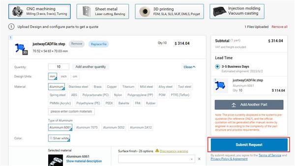 Select CAD files and fill in specifications, click the " Submit Request" button to continue.