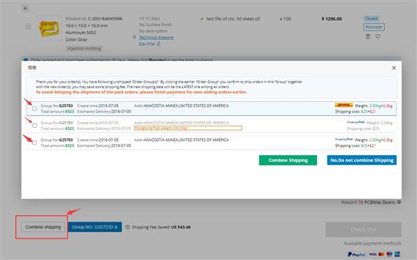 1. The purpose of order combination is to save shipping cost. If your schedule for your parts is not tight, combine your orders and ship together.